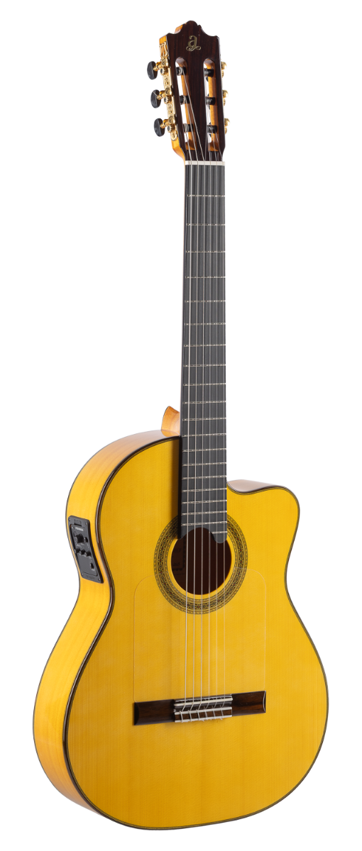 ADMBULECF admira Bulería serie Flamenco cutaway fishman Tapa: Abeto Macizo. Aros y fondo: Ciprés con ribetes de madera. Brazo: Cedro con refuerzo de Ébano. Diapasón: Ebano con 20 trastes. Clavijero Der Jung: Dorado lira con palometa negra Ratio 1:14. Puente: Palisandro de 12 agujeros. Cejuela: Hueso. Acabado: Alto Brillo. Cuerdas: Savarez 500CJ. EQ: Fishman Classic Blend. Ecualizador de 3 bandas con afinador y micrófono. Golpeador: Colocado. Nº Trastes: 20. Las imágenes publicadas pueden diferir ligeramente del producto final.